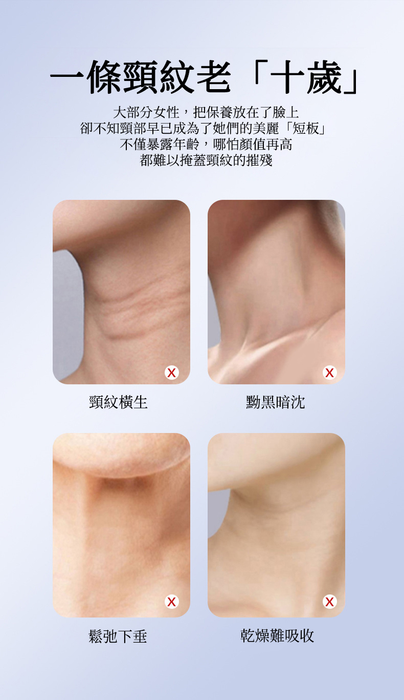 脖子是女人的第二張臉,頸紋多一條,視覺年齡直接老 5 歲!別讓臉蛋維持在 25 歲,脖子卻出賣了妳。每天5分鐘向上提拉,把失蹤的下顎線找回來。